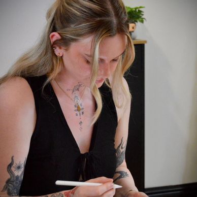 Amy is our talented apprentice, specialising in detailed concepts. With a love for soft shading, fine details, and storytelling through subtle contrast, she’s already showing a natural flair for creating beautiful, expressive tattoos.